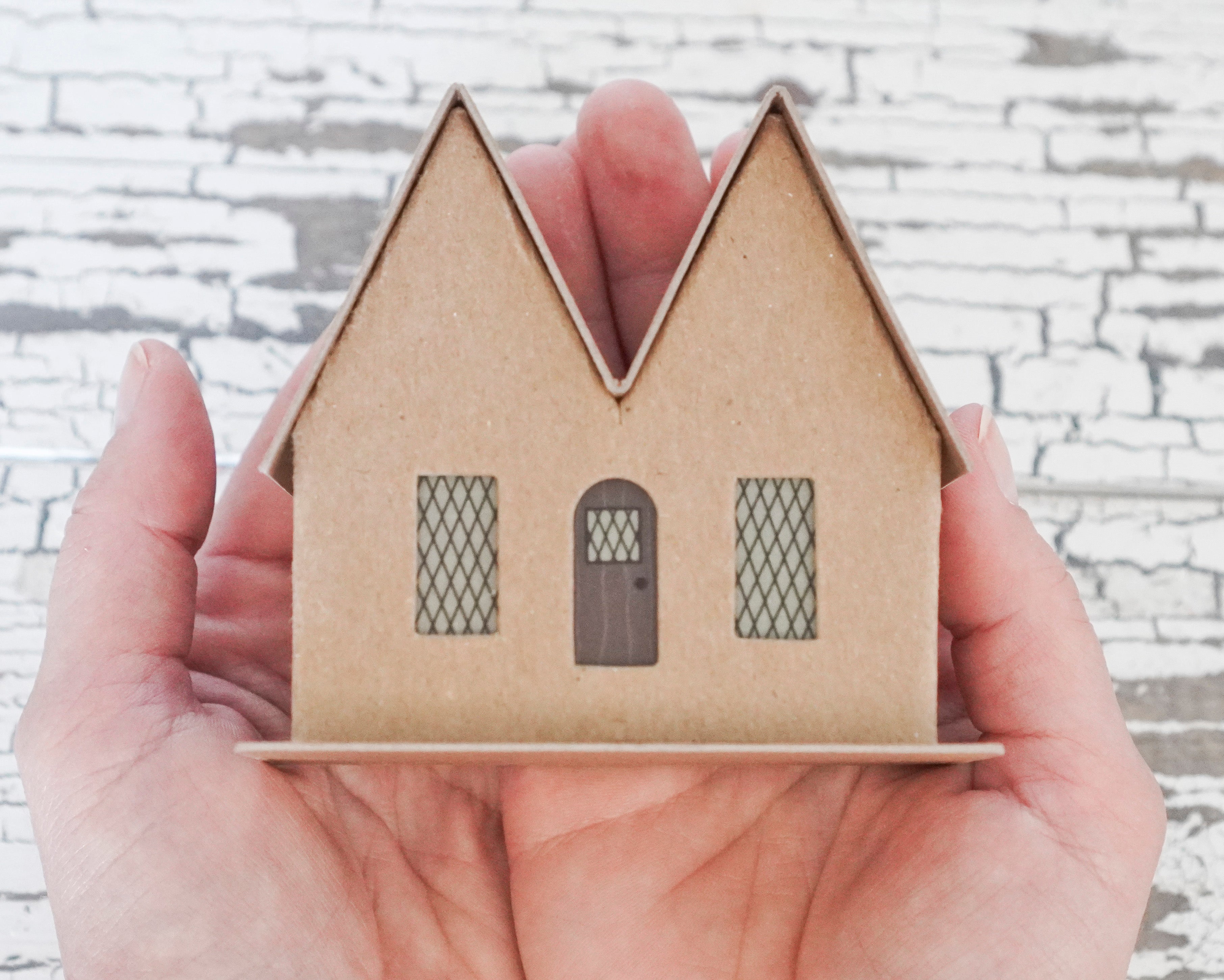 This house kit includes three die cut and scored chipboard pieces, a translucent door and window sheet, and instructions for assembly. The chipboard is 1mm thick, is acid free, and will accept craft paint, glue and glitter.